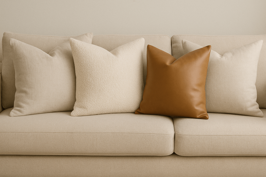 Mixing textures is key to keeping a neutral palette interesting. Look for linen, boucle, or faux fur pillow covers in off-white, taupe, and camel shades. Buying just the covers and swapping them seasonally keeps costs down.