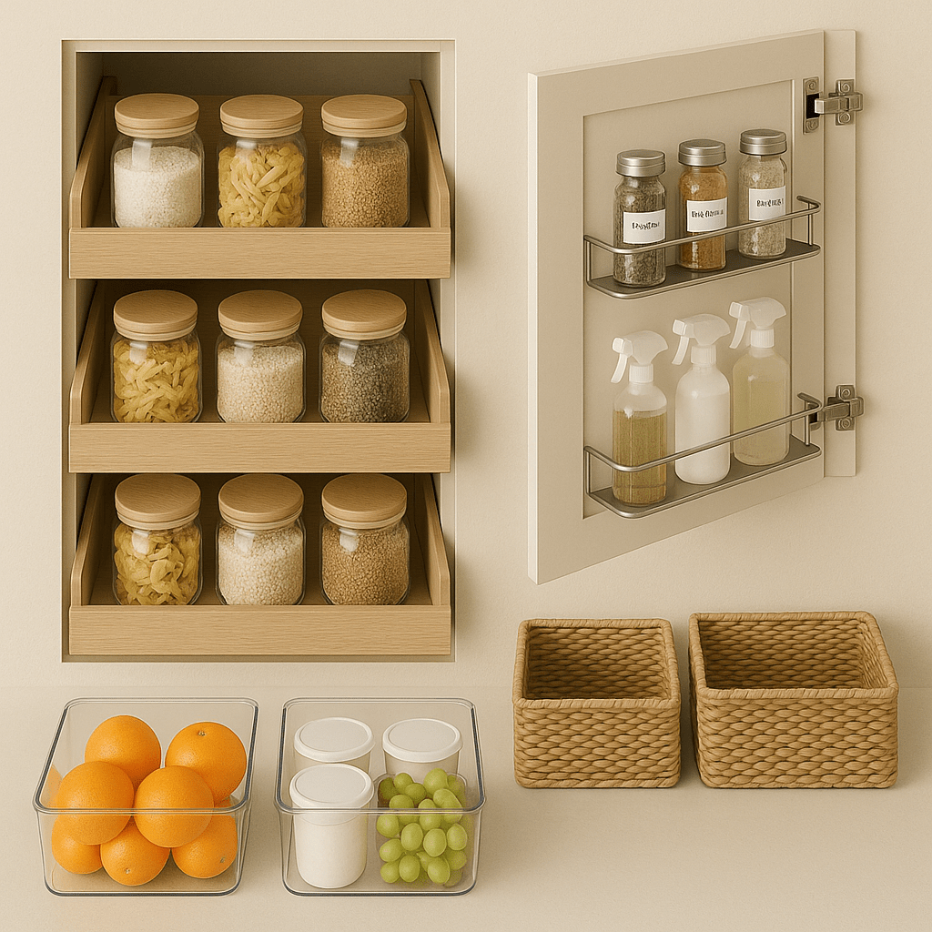 - Install slim racks inside cabinet doors for spices or cleaning supplies.