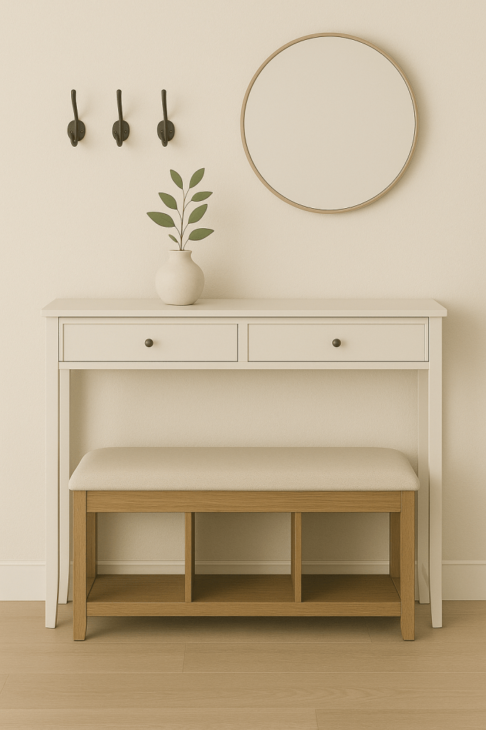 - A slim console table with drawers hides mail and keys.